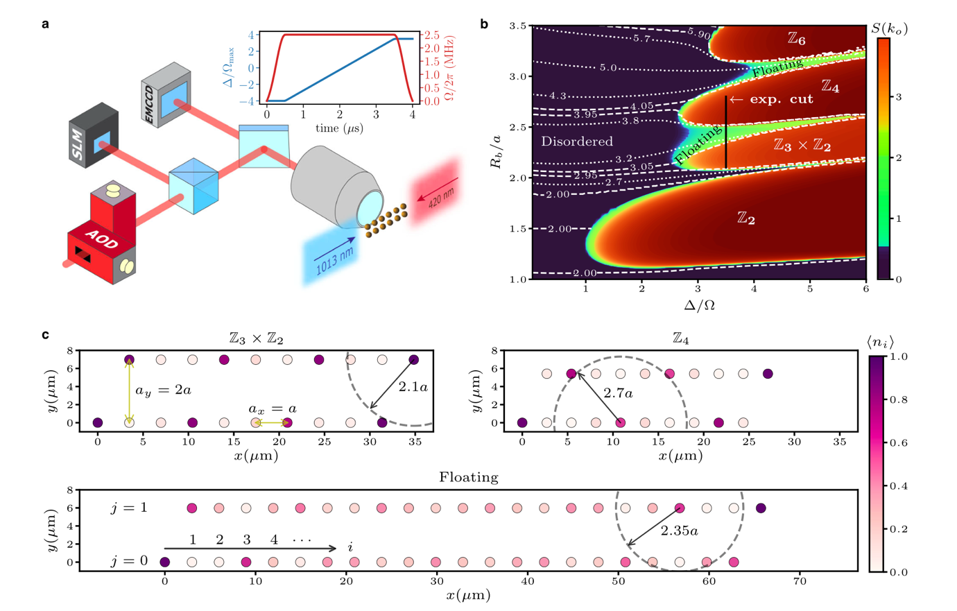 图1,(a)原子首先被装载到由空间光调制器(SLM)生成的双腿光镊梯形阵列中,随后利用由一对交叉声光偏转器(AOD)控制的第二组移动光镊,将它们重新排列成无缺陷的图案;(b)利用结构因子展示了格点间距为ay= 2 ax的双腿光镊梯形阵列的基态相图;(c)实验测得的里德堡态占据密度展示了Zp有序相和量子浮动相的特征。