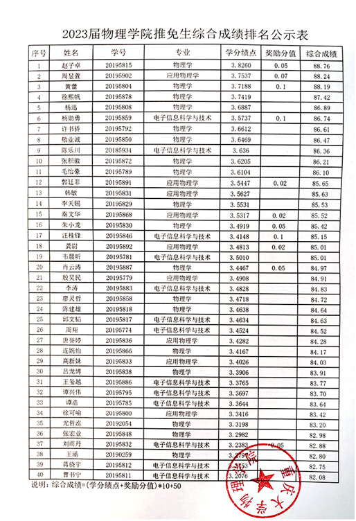 根据学校《关于开展2023年推荐优秀应届本科毕业生免试攻读研究生工作的通知》和《物理500彩票本科毕业生推免攻读硕士研究生实施细则》的相关规定,经过报名、初审、公开答辩程序,现将物理500彩票2023届推免生综合成绩排名予以公示: